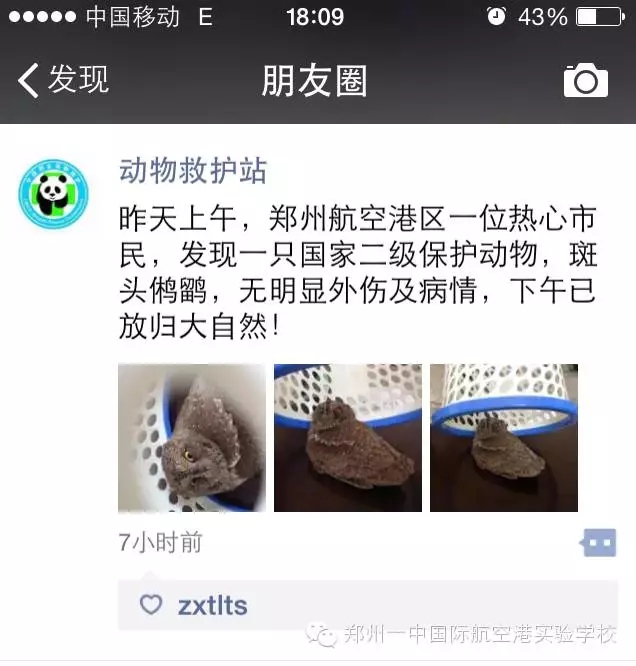 2016年4月8日,郑州一中国际航空港实验学校教师热心救护一只国家二级重点保护野生动物——班头鸺鹠(俗称“猫头鹰”)。